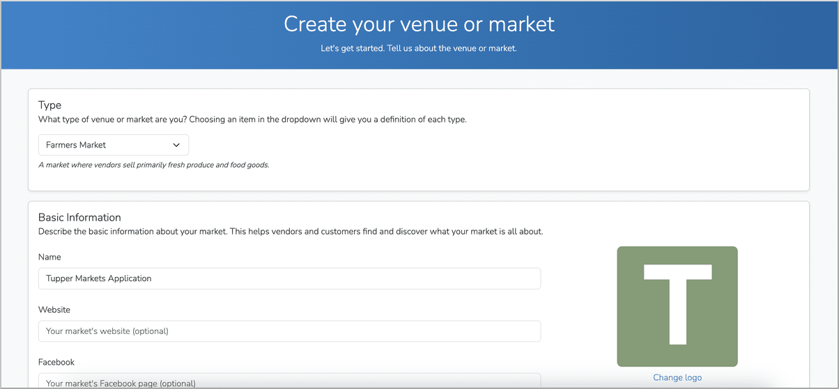 - Give your virtual market a name that informs your vendors it is where they access your application. In this example we called it, "Tupper Markets Application"