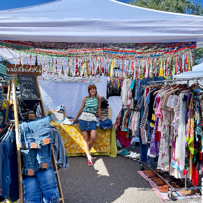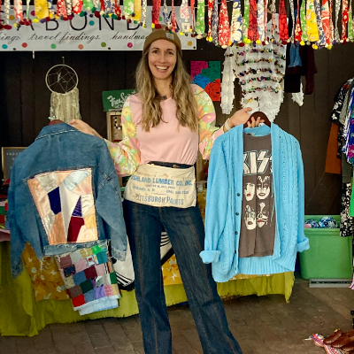 The result is an ever-evolving, curated mobile and online shop where shoppers can find quality secondhand clothing, accessories, and textiles from eras past, as well as one-of-a-kind upcycled pieces incorporating various secondhand elements. From colorful 1960s minis and printed button-down tops, to staples like high-waisted trousers and denim jackets, I strive to have something for every style and budget on tap in the Vagabondia trove.