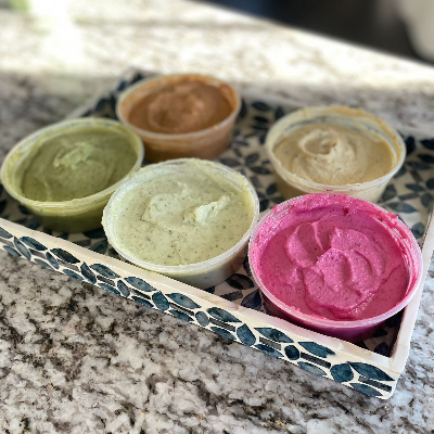 Fresh Garlic Dip: Plain, Roasted Garlic, Spicy, Basil, Cilantro, Beet, Carmalized, Arugula.