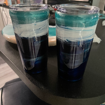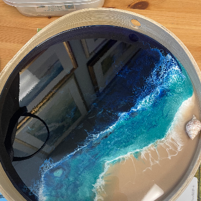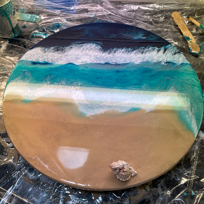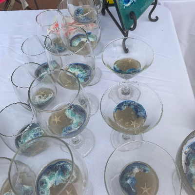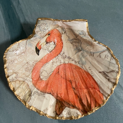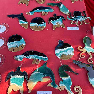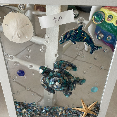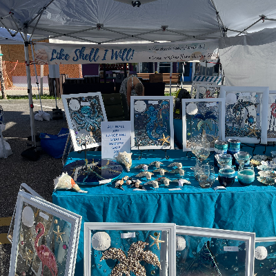 I sell beach themed wall art I create with metal, shells, painted beach figures like flamingos and dolphins. Also resin wine glasses, tumblers, ornaments and magnets. Decoupaged shells and nightlights. Lazy Susan’s and trays