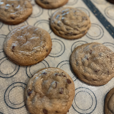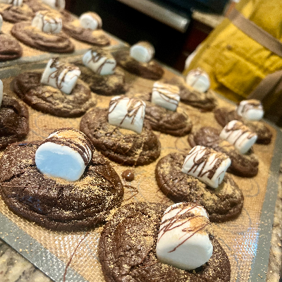 Freshly Baked Cookies. We have three flavors monthly, "Crispin's favorite" - Snickerdoodle cookie filled with dulce de leche, "S'more S'mores" - Double chocolate cookie with chocolate chips topped with marshmallow and graham crackers. and one cookie that will change monthly. This month of August is "But First Coffee" this is a classic chocolate chip cookie with a hit of coffee. Also we add to our menu mini chocolate chip cookies.