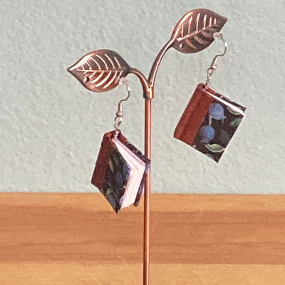 Handmade book earrings, bottle jewelry, journals, and potion bottles.