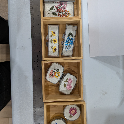 I sell prints of my paintings (lots of animals and flowers), embroidered pill boxes, and cotton masks.