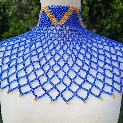 High Neck Blue & Gold Beaded Collar Necklace