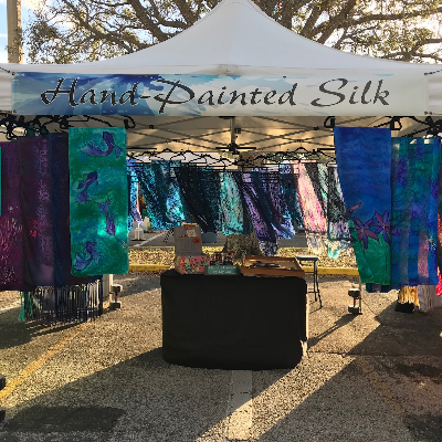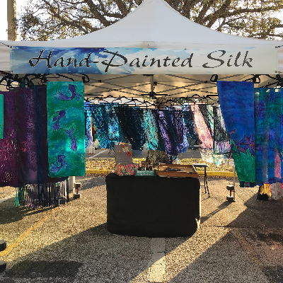 I started my silk painting business when I was laid off of my corporate job in 2009. That life challenge got me painting on a daily basis and I started selling my work at Pass-A-Grille on Saturday mornings. The Saturday Morning Market found me at an annual art show and graciously invited me to join I have been forever grateful!!