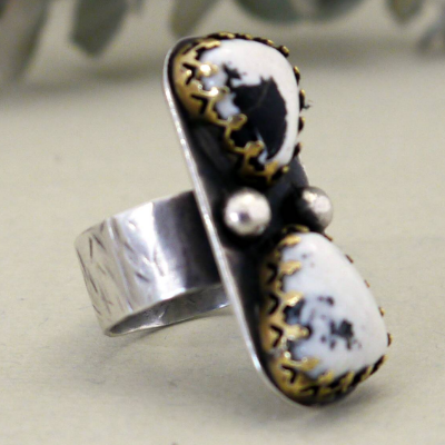 I also make silver jewelry. Using traditional metalsmithing techniques I use raw materials to create rings, earrings and pendants with natural stones like carnelian, opal and turquoise. I cut, saw and use a torch to mold the silver sheet and wire. I make my own bezels and components for each piece.